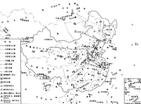 远古的人们在产玉的溪流和冲积扇采到了玉璞之后,将其搬运到住地或城塞加工成器。久而久之,采玉、运玉不断地经常往返,便踏出了一条专门用于运玉的小道。由于我国玉资源分布极广而又不平衡,玉产地往往与政治、文化中心相距甚远,最终形成的多条运输玉石的主次干线,并组成互为交错的网络,这就是我们所称的历史上的“玉石之路”。这种玉器起始是区域性的,相当于考古学的文化区域,经过几千年的沟通,由小道变成通途,竟成了几个文化区域通用的玉石干线,最终形成全国性的运输玉石和丝绸、珍宝等物资的运输线,它也是远古最早的的商路,打通区域阻隔,构成区域性的或全国性的由疏到密的“玉石之路”网络(见附表:史前一西周“玉石之路”示意图)。这并非我们凭空臆想,而是一桩被人遗忘了的史实。当今的任务则是,我们必须通过考证而得知往昔运输玉石的交通路线的本来面貌。