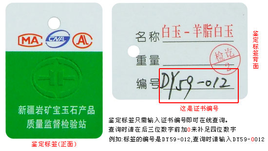 四、鉴定标签,产品经过鉴定的标志,有产品鉴定名称、重量和鉴定编号。