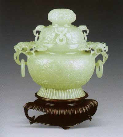 痕都斯坦风格翠玉花形纽香炉 清 高14.5厘米 我国地域辽阔,在不同的地方有不同的雕玉风格。主要常见的为京作、苏作、西番作。京作即北京的玉石雕刻,也叫做北方作。它从造型上看多立体器物,即浮雕的多。京作品种繁多,有各式各样的造型。做工有勾花、勾撤、高浮雕、打洼等复杂的雕琢。做出的玉器大气、朴实,神态自如逼真。苏作是苏州雕工王器,代表着南方的工艺,也叫南方作。它多雕小件器物,如别子、佩饰、花片,玉坠、玉牌、玉环、烟壶等。苏作的特点是造型简单,做工单纯,但像烟壶、佩饰则做工精细,注重神态,图案精美。西番作就是痕都斯坦玉器。当时的痕都斯坦尽管有佛教的遗迹,但其地仍是一个以信仰伊斯兰教为主的地方。我国新疆维吾尔族也信奉伊斯兰教,因而痕都斯坦玉在新疆一带广为流行。痕都斯坦玉制作从清代开始流行,乾隆时期是西番作工艺最鼎盛时期。西番作的特点是多选用纯白的玉材来雕琢,追求一种纯净的美。它是以实用品为主,如碗、盘,壶、刀把等。西番作的雕琢胎子以薄、轻二字即可概括,清高宗誉之“莹薄如纸”,比之为“蝉翅”。由于器物壁细薄,甚至可以从内壁看到外壁上的雕花,给人以透明或半透明感。它的装饰图案多以写实的花果为主,尤其以莨苕和成翻卷状。它的纹饰多是剔地阳纹,即浅浮雕的工艺手法。西番作的作品富有少数民族的特色,具有中西结合的味道。