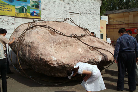 5月21日早晨9时30分,从新疆和田一路走了5天的拖车终于把一块52吨的巨石运到了新疆地质博物馆后面。10时30分,52吨巨石在两台起重机帮助下被放置在新疆地质矿产博物馆后面青年帆布厂的大门旁。巨石占地约30平方米,高约2米多,巨石下垫着的四五个轮胎有的已被压扁。