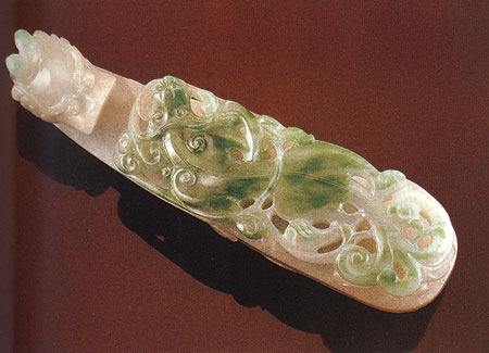 笔者认为,在人类的视觉感受中,物质的形体和色彩是认识事物的第步。从某种角度分析,人类对自然界的色彩敏感和掌握程度又超过对物质形态的把握。比较色彩和形体,色彩的感情意味更浓,比如“感情色彩浓厚”早已成为人们评论事物的常用语。再比如中性色中的白色传达出细腻、纯洁,灰色传达出坚实和幽默,黑色传达出深沉和冷静;彩色中红、橙、黄称之为“暖”色,蓝、绿、紫则称之为“冷”色此外不同明度和饱和度的颜色会产生轻、重、软、硬之感觉等等。由此可见,在观察玉雕作品时第感觉应是颜色。颜色美与玉材的品质是息息相关的,因此可以进一步引申:玉雕作品鉴赏和评判的第步是对材质的鉴赏。
