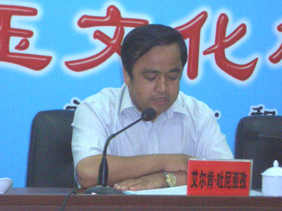 目前,和田经济建设和社会发展步入了良性循环的快车道,民族团结,社会稳定,经济发展,边防巩固,人民群众安居乐业。开放的和田正在掀起全面建设热潮。素有“金玉之邦”美誉的和田,资源丰富,自然风光独特,人文景观独有,民俗淳朴自然。我衷心地希望各位专家、学者、工艺美术工作者在和田多走一走,多看一看,更详实地把和田的新变化、新面貌和新优势告诉给您的亲朋好友和身边的人。你们就是我们和田推介使者,通过你们的宣传,让更多的人到和田来观光旅游、投资兴业、交流合作。