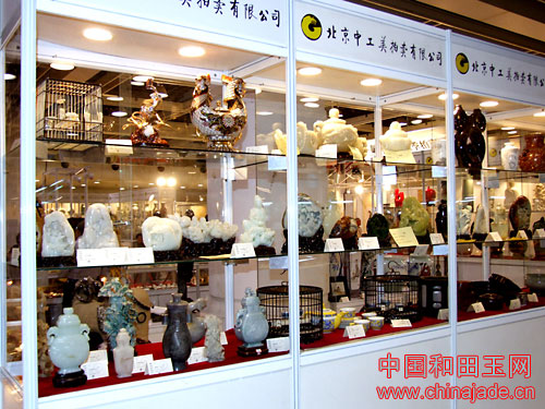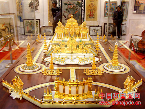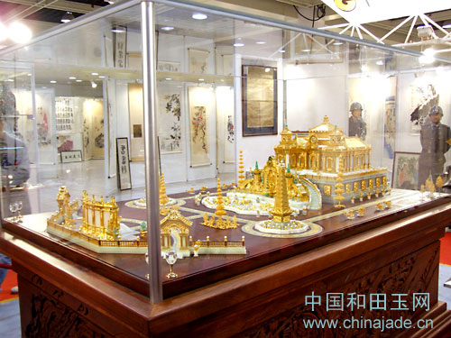 新疆展馆在世贸中心的1号展位的3号大厅,与中工美的国宝《圆明园金玉大水法》在一个展厅。值得一提的是《圆明园金玉大水法》的建筑骨架均采用新疆和田玉所制,除了4000多颗珠宝,钻石点缀之外,体现的是中国玉文化的精髓,正如中工美拍卖公司总经理富振洋所说“国宝与和田玉共舞”。