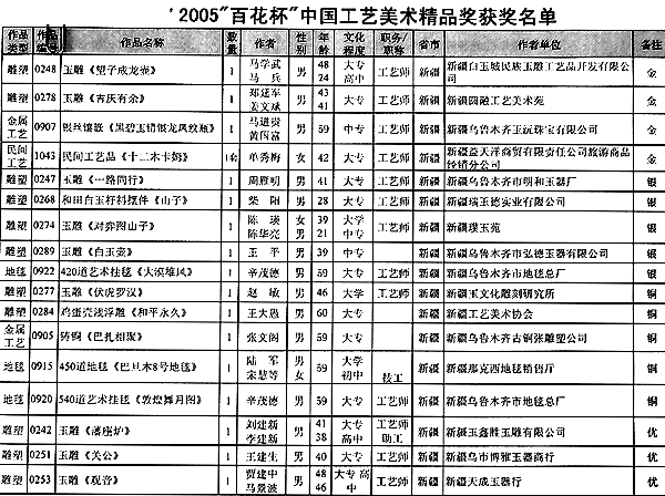 这次“百花杯”设立了五个精品奖项:特等奖5名,金奖96名,银奖106名,铜奖116名,优秀奖226名。新疆评选的作品共68件,其中28件获奖,分别是金奖4个,银奖5个,铜奖5个,优秀奖14个。在雕塑类玉雕作品里就有3个金奖4个银奖,1个铜奖,12个优秀奖,占新疆工艺美术获奖作品的70%以上。