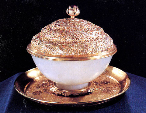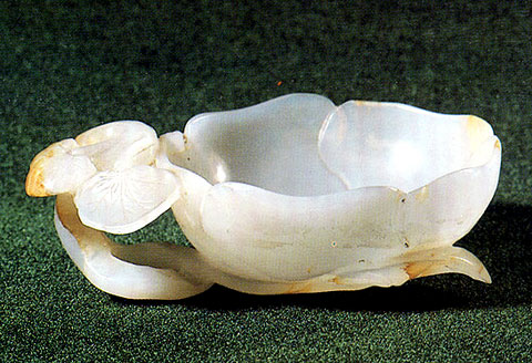 白玉花形杯,高3.2 厘米,口径7.3厘米,和阗白玉杯作葵花形,以其梗叶作柄足,不仅作工精细圆熟,是明洪武(1368-1398年)时内廷之作,而且突出温润莹泽之玉质美,德符咸佳,作工、表现上均为精美的玉雕艺术品,也是明初玉器代表作。